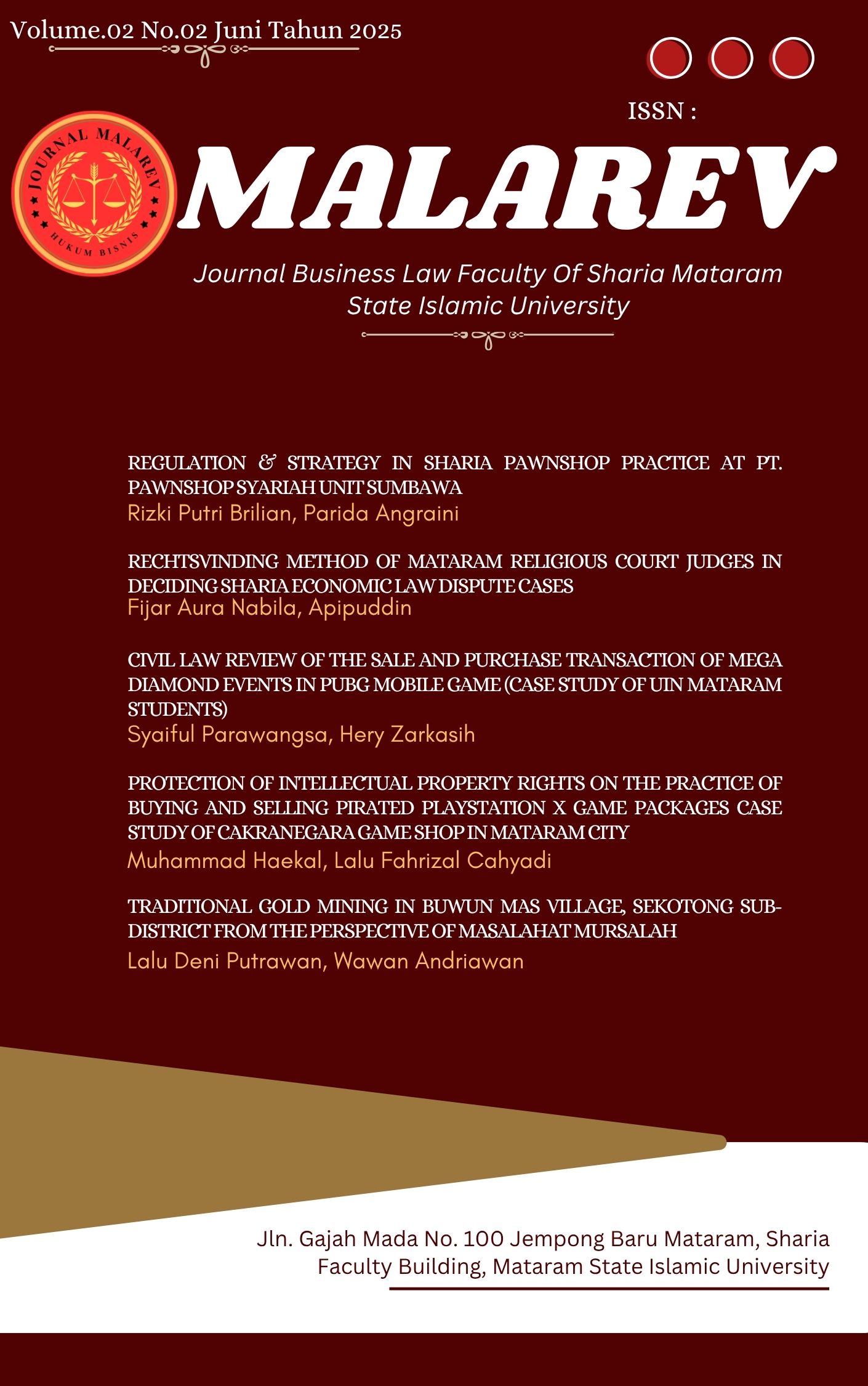 Vol. 2 No. 2 (2025)Malarev : Journal of Business Law Is periodical academic journal published twice a year (in June and December). The Malarev journal is published by Business Law Program Study Mataram State Islamic University. The Business Law Journal publishes articles on research results, conceptual thinking, and legal reviews related to legal aspects in economic and business activities (Digital Business Law, Corporate and Corporate Law, Business Contract Law, Investment Law, Banking and Finance Law, Capital Market Law, Competition and Antitrust Law, Bankruptcy and PKPU Law, Consumer Protection Law, Intellectual Property Rights (IPR) Law in Business, Business Tax Law, International Business Law). We are very open to the contributions of academics, researchers and experts from various disciplines related to this scope.
